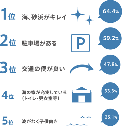 今年の夏に海水浴に行く予定の回答者の海水浴場を選ぶポイントは、「海、砂浜がキレイ」が64%と最もスコアが高く、以下、「駐車場がある」59%、「交通の便が良い」48%「海の家が充実している(トイレ・更衣室等)」と続く。
