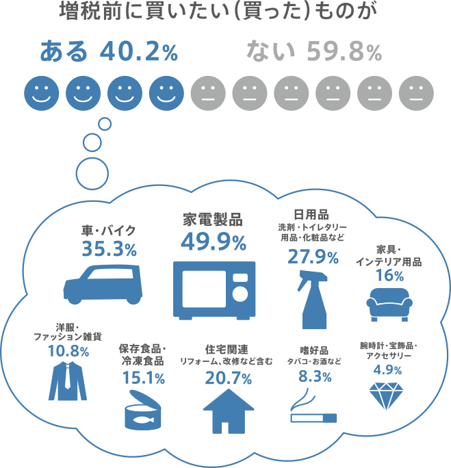 節約志向の中で、反対に駆け込み需要も期待される。そこで、消費税率引き上げ前に買っておきたいものや、それを見越してすでに買ったものがあるかたずねると、「ある」と答えた回答者が40.2%を占めた。現時点で、4割の人は消費税率引き上げを意識した買い物をするという結果となった。